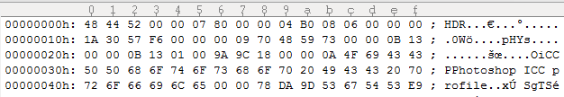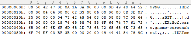 If we look at a random normal PNG file header we can see the same HDR bytes, and the missing 13 bytes in front of it: