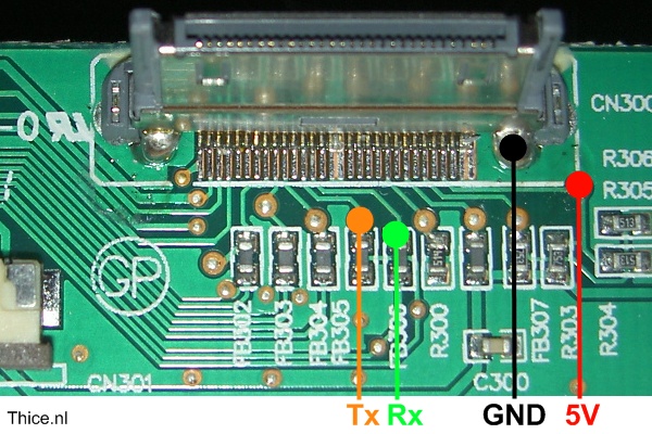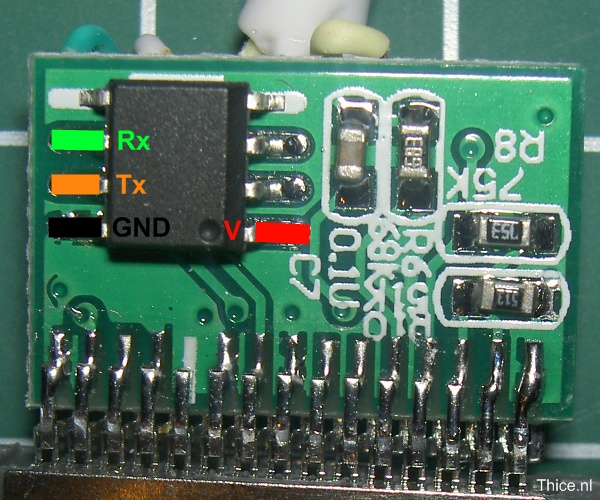 Because the solder pads of the pins are really small I looked for some alternative locations to solder the wires to. For the 3.3V connection I found an alternative point that is 5V, which does work with the chip that was used. The locations of the solder points can be found on the following picture: