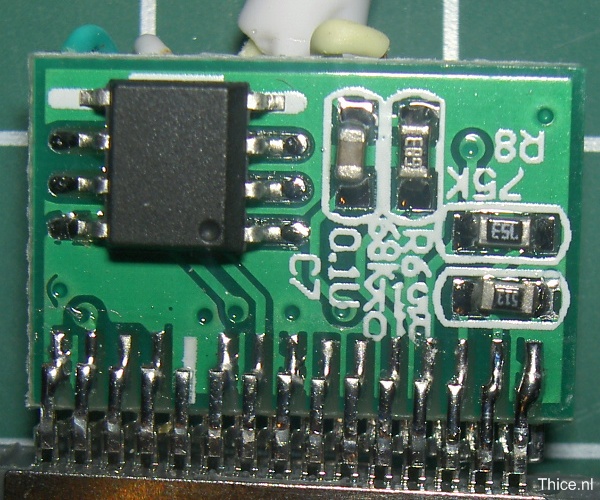On the other side of the PCB we can see the chip we are looking for. The chip is blank, so no information on the chip there. We can see that it has 6 soldered legs, and two unsoldered ones. Also on this side the PCB is pretty basic with just a few components.