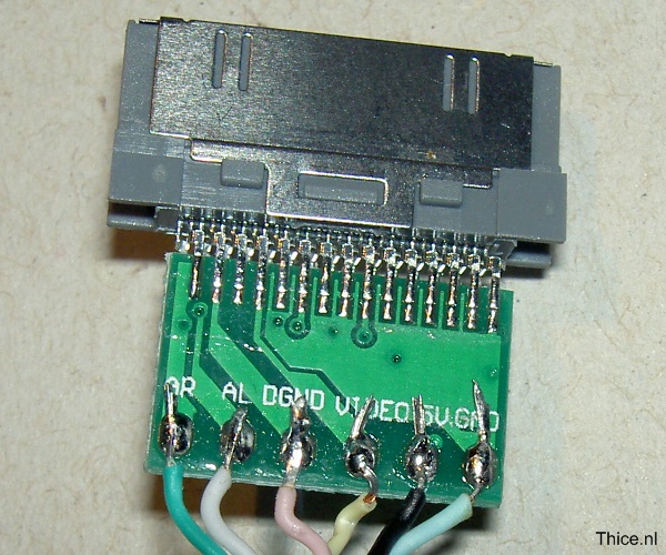 When we zoom in on the connector we see a very plain PCB (Printed Circuit Board, the green board with the electronic components) with just 6 wires connected. These are the wires to the different connectors on the cable. We will remove these wires from the PCB.