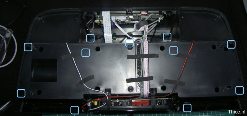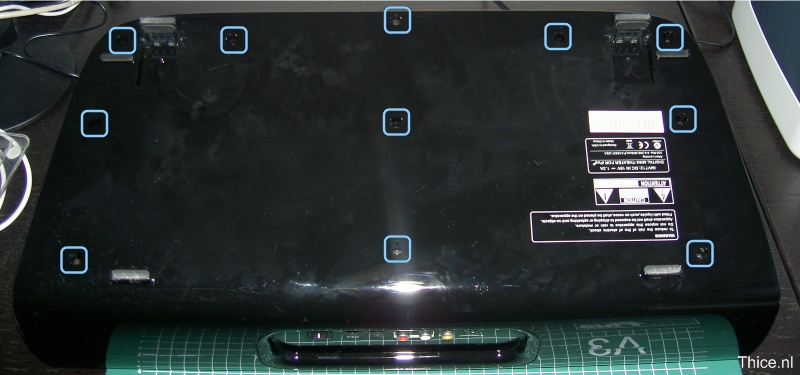 After the 11 screws are removed you can remove the bottom part of the case. With that part of the case removed you can remove the next 11 screws on it. Some of the locations of the screws might not be clear on the picture but will be clear when you open the dock.