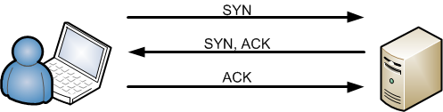 A normal TCP handshake contains three packets, a SYN packet which is being sent from the client to the server, on which the server replies with a SYN,ACK packet, on which the client on its turn replies with an ACK packet. This handshake is shown in the schematic overview below. More information on the TCP handshake can be found on Wikipedia here.