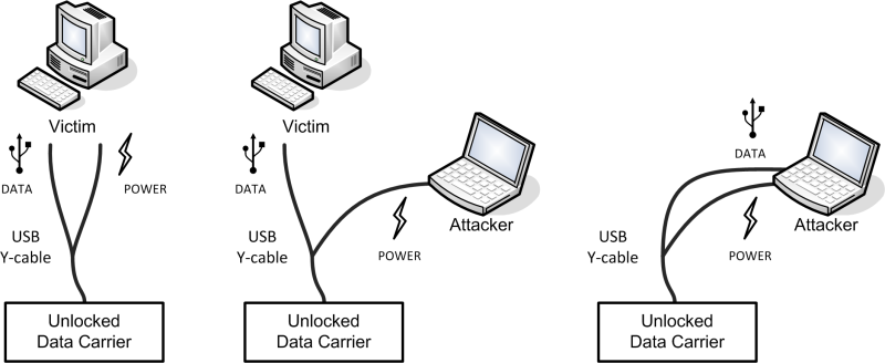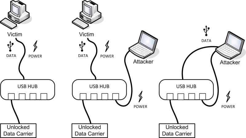 The above described attack has been successfully tested against USB hubs and USB Express Cards. Instead of connecting the data carrier to another system directly a variation of all the different attacks would be to use a mobile power source (like a battery) to power the data carrier during the theft. The data carrier can than be connected to another system at another location while being powered in the mean time by the battery. This can also be useful for acquiring unlocked data carriers of this kind during a forensic investigation.