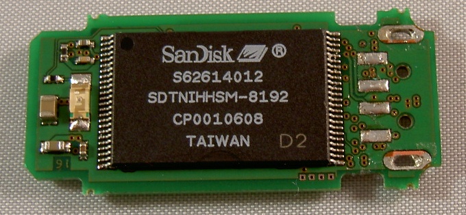 Stripping the USB stick is much easier than stripping the USB hub. USB sticks usually only contain a plastic encasing and a USB connector besides their main PCB, an exception to this being the reinforced and special protected USB sticks, which are therefore less suitable to use for this kind of projects. After removing the outer casing of the USB stick the USB connector can be desoldered, resulting in a small PCB containing the memory chip and some other small components. The result can be seen in the following image.