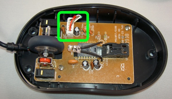 The USB mouse will not be stripped down further, however, to make more room it would be possible to cut away some of the plastic inside it, or even to reduce the size of the PCB. Inside the USB mouse the USB cable will be connected to the PCB, this can be done by soldering or by a connector. The image below shows the connector inside the mouse used in the example, in this case the cable is connected by a connector.
