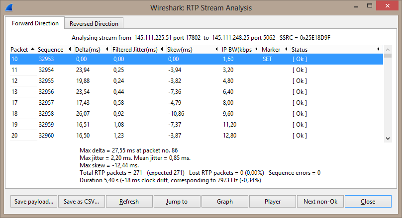 The VOIP packets should be RTP, however the PCAP shows them as UDP. To correctly recognize the packets as RTP we need to click on the UDP packets and (right mouse click) set Decode As–>RTP. After that we can use the Telephony menu–>RTP–>Stream Analysis. The following screen will then show up: