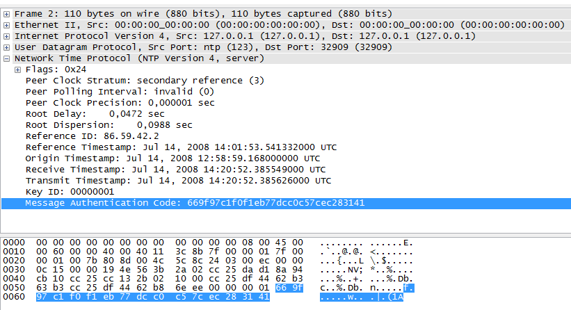 It seemed that NTP makes use of a “Message Authentication Code”, which is generated from the packet combined with a shared password between the client and the server. It took quite some reading to get clear what data actually needed to be combined for this MAC. To be sure that we were doing it right we first tested our approach with an example NTP packet from Wireshark: