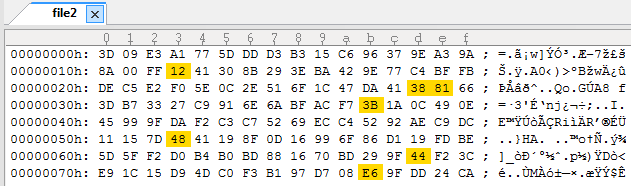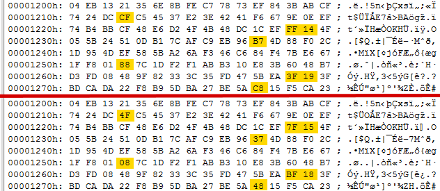 The files generated by fastcoll in this example are shown below with their differences marked in yellow: