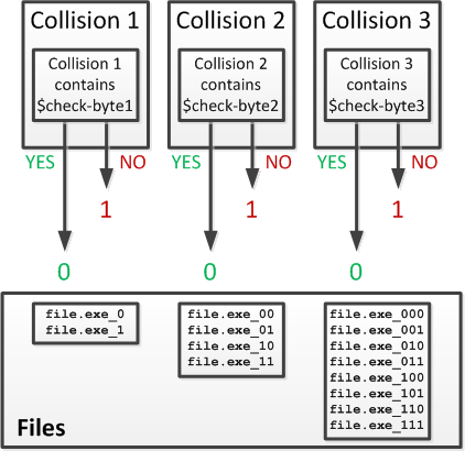 So, each file contains both the friendly code and the evil code, but only one of the two will be executed depending on the collision found in the file.