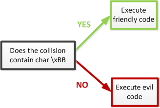 Since we now have two different strings with the same MD5 we can use these strings in our own code to create two different files with the same MD5. We can use the collision string to differentiate between the two different files. The collision strings will be different by a couple of bytes, these different bytes can be used to create checks to find out which of the two files is currently running. In the example above we can use the char \xBB as a check (check-byte) if the collision is the first string or the second, when the check-byte is found the executable will then execute a friendly code, and when the check-byte is not found the executable will execute an evil code.