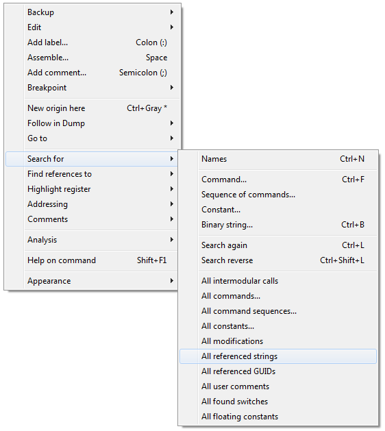 To be able to search for strings in OllyDbg we need to bring up the Text strings window which can easily be done by clicking the right mouse button somewhere inside the main OllyDbg window and select Search for and then select All referenced strings. The screenshot of this action is shown in figure 5.