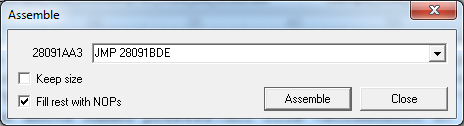 To change the previous jump to this new destination, we need to double click the JNE jump instruction beneath the ASCII “p2x” string and adjust the jump instruction so that it points to the new location we just identified (the one above theASCII “.pll”line). We will change the jump from a JNE (Jump Not Equal) to a normal JMP (Jump) so that all the files will be dropped by the program including the Perl source code that we are after. Because the assembly instruction for this jump is a different size as the instruction we are changing we need to make sure that the option Keep size in OllyDbg is not selected as can be seen in figure 6.