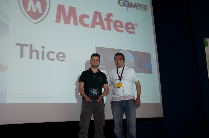 The price I received was a trip + stay to Las Vegas and a ticket to the Defcon conference (hence the Defcon Challenge name 😉 ) sponsored by McAfee. The symbolic price I received on stage can be seen below: