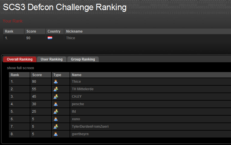 The SCS3 Defcon Challenge Ranking at the end of day 1 can be seen below: